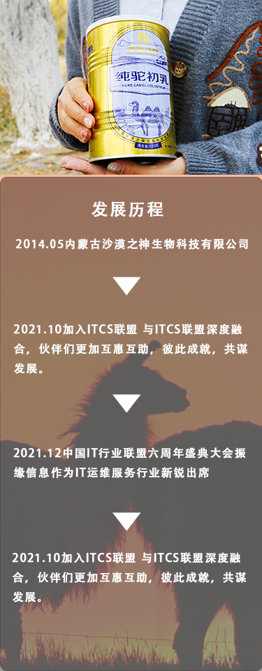 内蒙古沙漠之神生物科技有限公司成立于2014年5月,是一家以骆驼系列产品开发、研究、生产和销售为一体的自治区级龙头企业。注册资金3000万元,占地面积2.1万平方米。现主营产品有液态奶、驼乳奶粉、驼奶片、驼奶皂四大系列十余种产品。科技引领发展,发展创造未来,公司坚持以科技创新作为先导,目前已获得有机认证、低GI认证,企业信用为A级,现有专利16项,其中发明专利1项,外观专利2项,实用新型专利13项。公司自成立以来,荣获“农牧业科技示范园”“自治区重点龙头企业”“全区脱贫攻坚优秀扶贫龙头企业”“高新技术企业”“中国农产品百强标志性品牌”“全国乳制品行业质量领先企业”“全国质量检验信得过产品”等30多项荣誉称号。